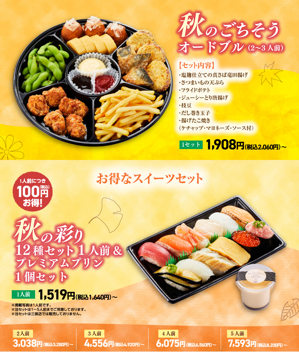 「秋のごちそうオードブル(2~3人前)」「3種のおつまみ」は現在販売を休止しております。