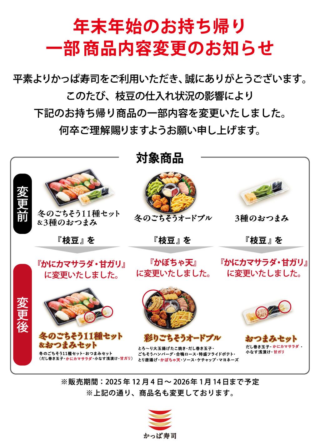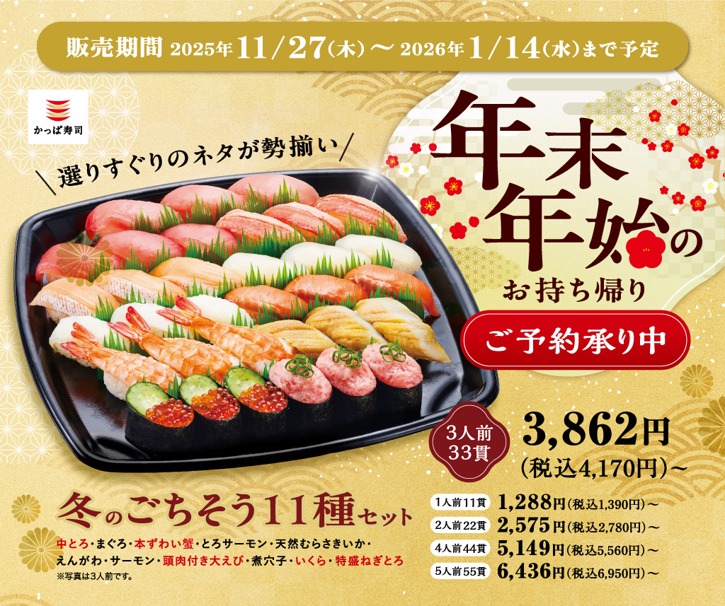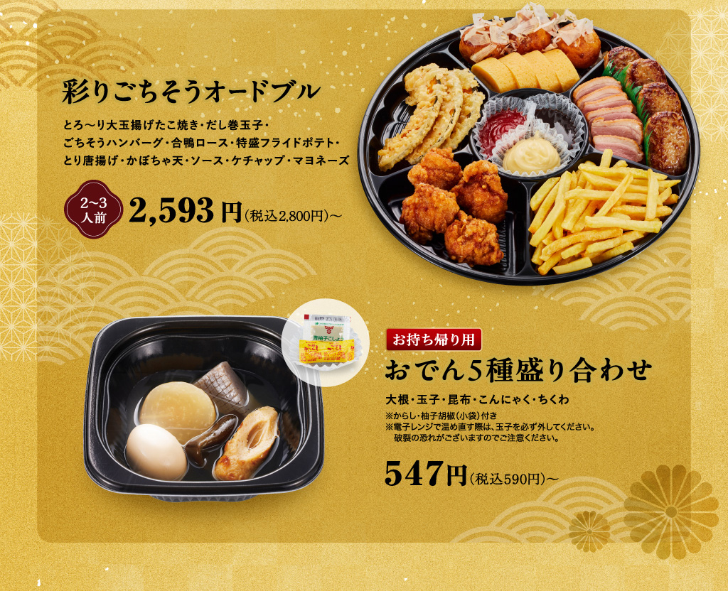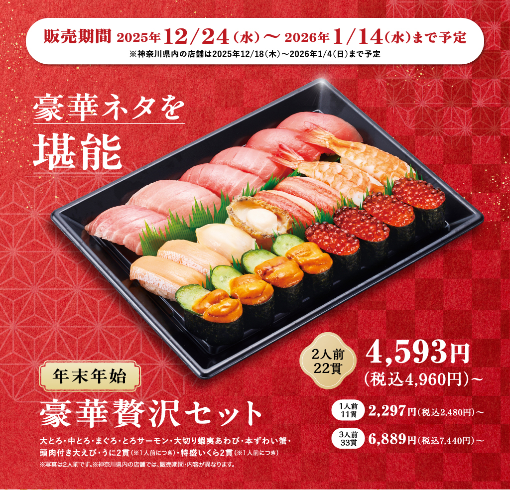 ※「年末年始 豪華贅沢セット」は、神奈川県内の店舗では、内容・販売期間が異なります。詳細はお持ち帰り注文サイトをご確認ください。