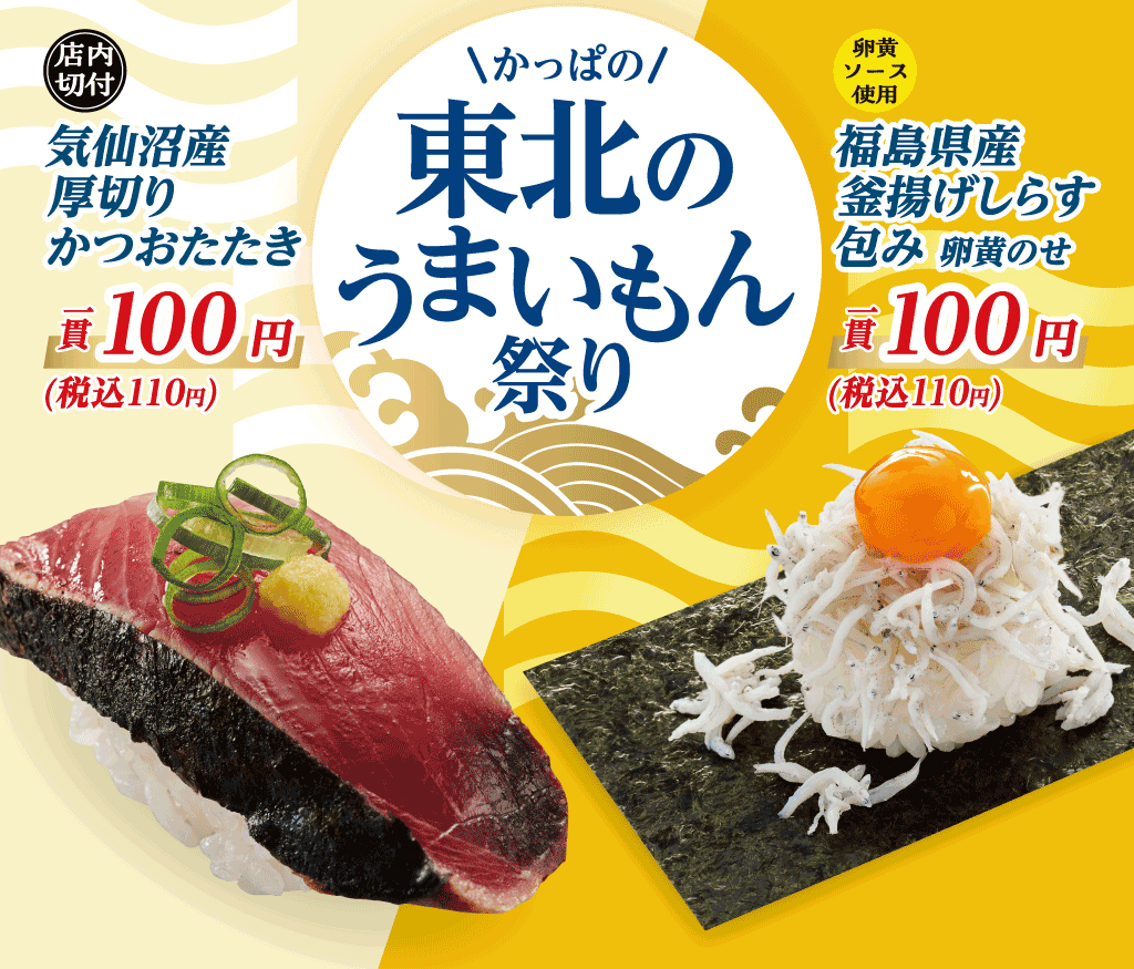 かっぱの東北のうまいもん祭り開催!気仙沼産「かつお」や福島県産「釜揚げしらす」など税込110円から
