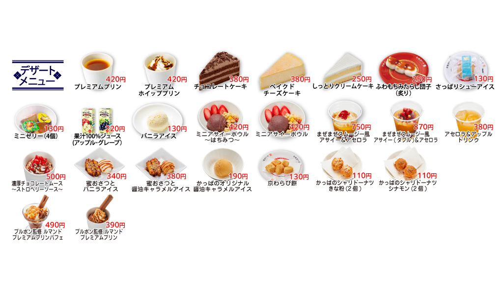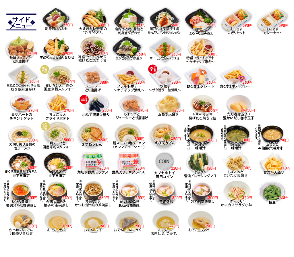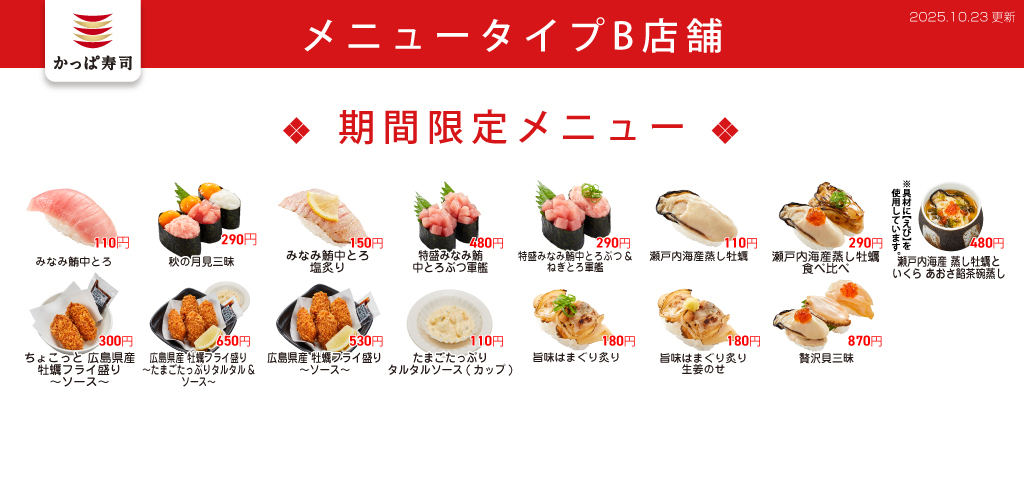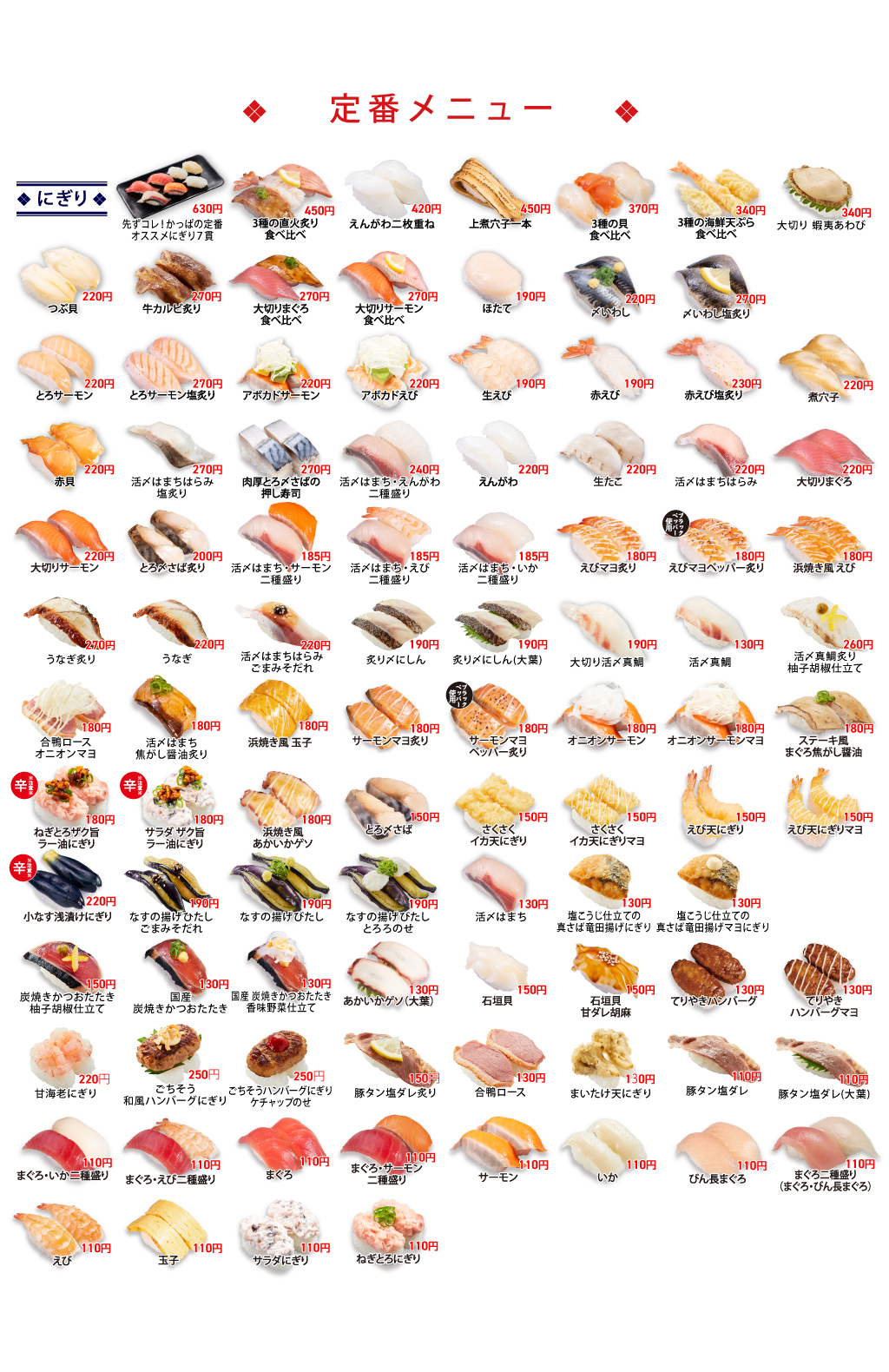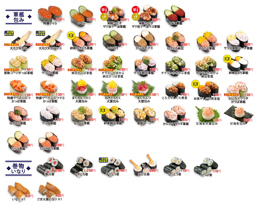 ※2025年11月19日まで おこさま39%OFFキャンペーン実施中!!詳細はこちらをご確認ください。※1の商品は、実際の提供方法とは異なります。※「ほたて」はサイズによりカット方法が変更となる場合がございます。※「かっぱ軍艦」はマヨネーズを使用しています。※掲載商品は、時期により販売休止または仕様変更となる場合がございます。※記載価格は全て税込価格となります。※店舗により価格が異なります。※定番メニューは掲載商品以外にもございます。※掲載の「包み」商品はお持ち帰りの際、軍艦でのご提供となります。※店舗により取り扱い商品が異なる場合がございます。天候、入荷状況、売れ行き等により品切れや販売終了の場合はご容赦ください。※掲載写真はイメージです。時期により実際の商品とトッピング等が異なる場合もございます。※店舗の混雑状況により多少お時間を頂戴する場合がございます。※加工・調理には細心の注意をはらっていますが、まれに骨などが残る場合がございます。※揚げ物は調理にお時間をいただきます。※当店は国産米を使用しています。